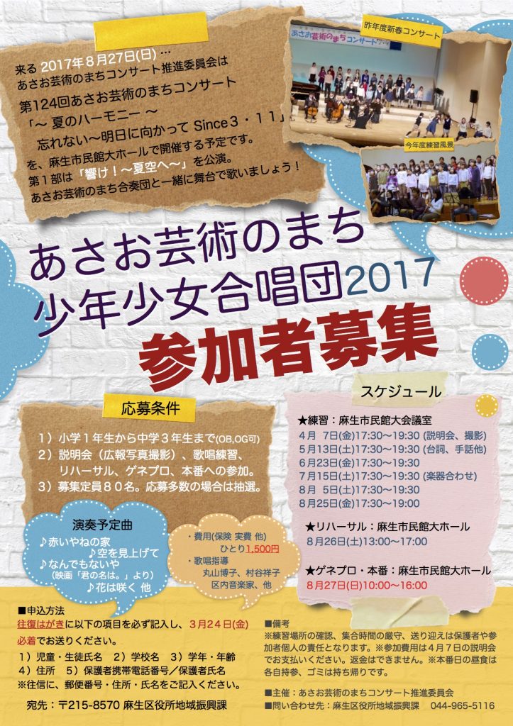 ホーム > ニュース&コラム > ニュース > あさお芸術のまち少年少女合唱団2017 2017/01/17 2017/03/27 PDFダウンロード 募集締め切りました。 カテゴリー コラム ニュース ニュース&コラム リンク 令和2年度 令和3年度 令和4年度 令和5年度 令和元年度のコンサート 出演者紹介 平成27年度のコンサート 平成28年度のコンサート 平成29年度のコンサート 平成30年度のコンサート 年度ごとの事業報告 未分類 次のコンサート 演奏動画 過去のコンサート(活動実績) B! LINEへ送る - ニュース