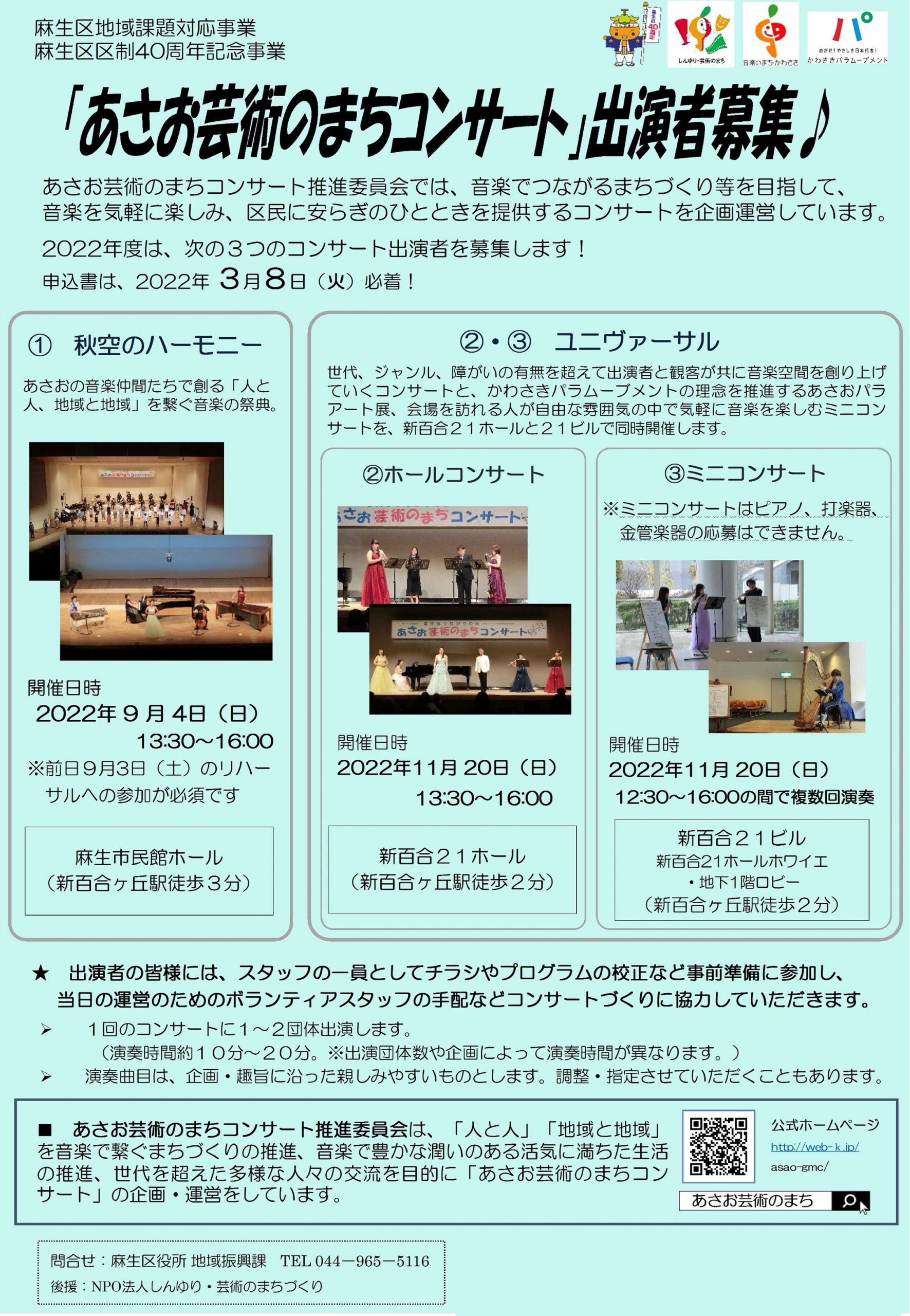 「あさお芸術のまちコンサート」は、区民が主体となり、区内のホールなどで区民の皆さまとともに楽しむコンサートを開催しています。令和4(2022)年度は、3つのコンサート出演者を募集します!個人またはグループで音楽活動をしている皆さま、ぜひご応募ください。
