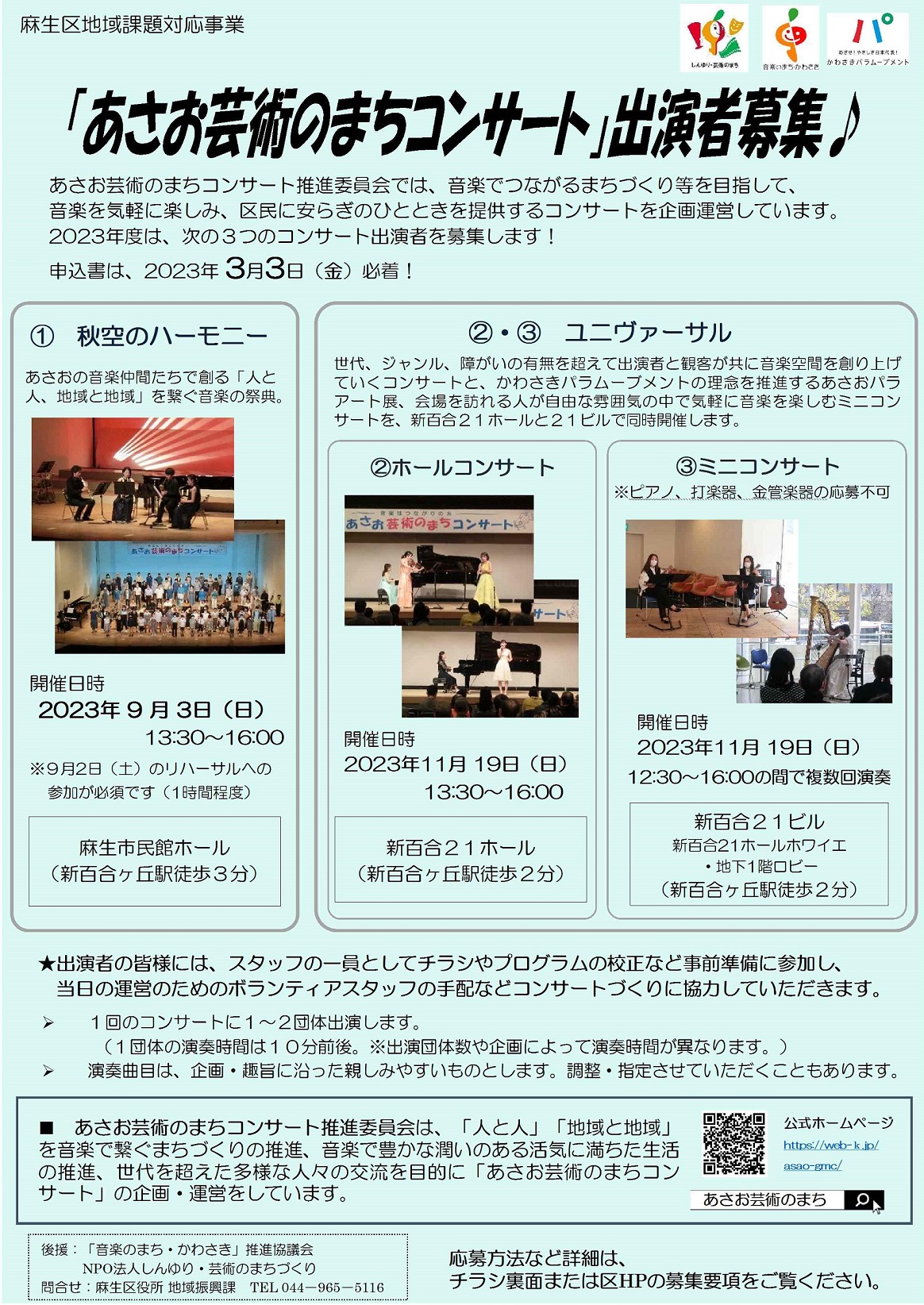 コンサートの開催趣旨に賛同し、出演を希望する方は、上の応募用紙を印刷・ご記入のうえ、演奏希望曲の中から応募と同じ編成で演奏した1曲のCD音源と写真を添えて、令和5年3月3日(金)必着で麻生区役所地域振興課(3階36番窓口)まで直接持参するか郵送でお申し込みください。