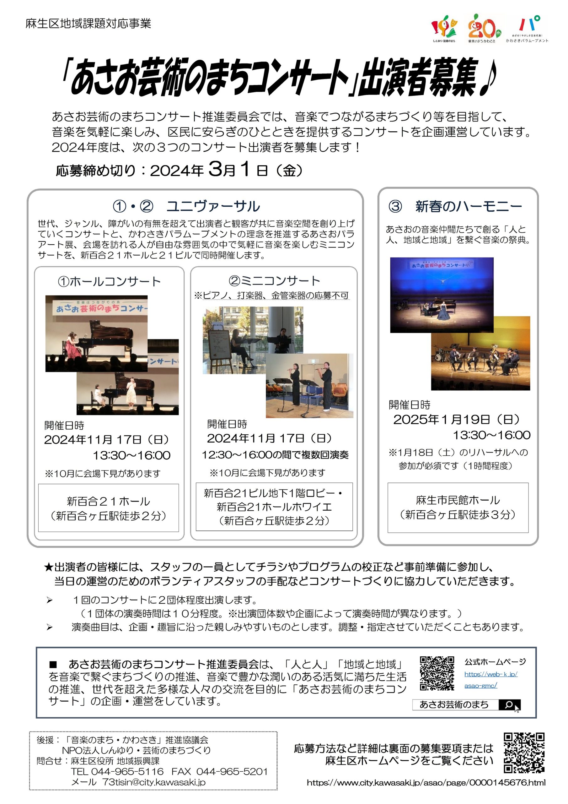 「あさお芸術のまちコンサート」は、区民が主体となり、区内のホールなどで区民の皆さまとともに楽しむコンサートです。令和6(2024)年度は、次の3つのコンサート出演者を募集します!個人またはグループで音楽活動をしている皆さま、ぜひご応募ください。